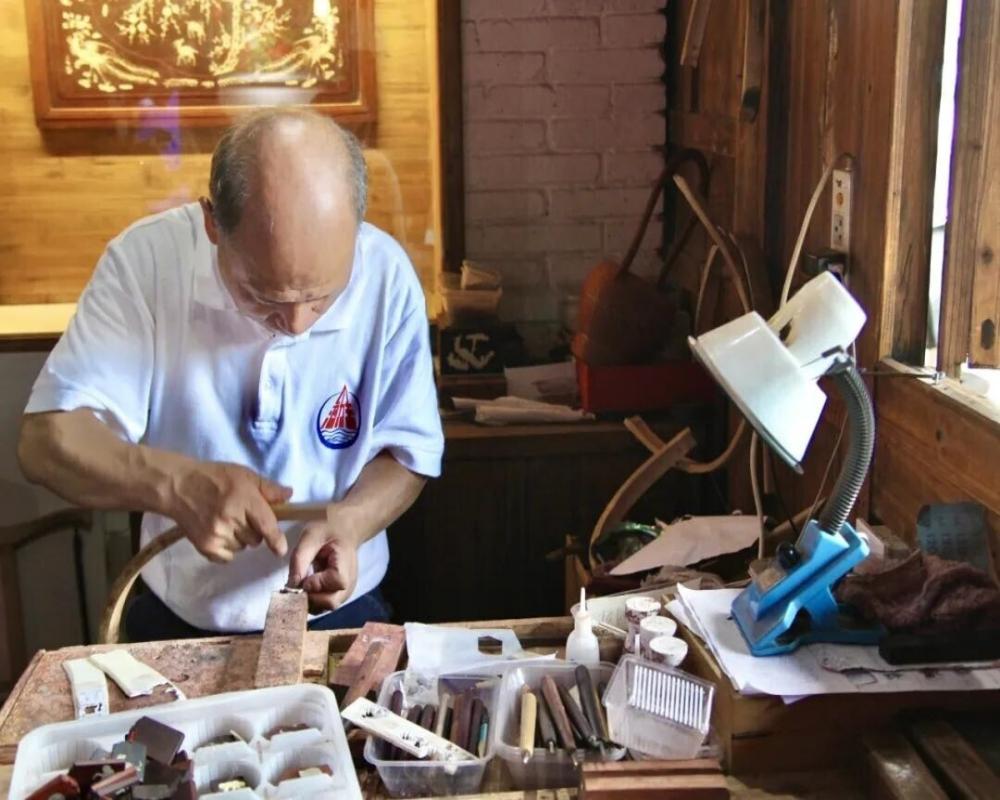 (圖為非遺傳承人在骨木鑲嵌,中國青年網通訊員 蔣雨軒供圖)
