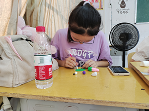 在炎熱的夏天,在一間沒有空調教室里,同學們無懼高溫,積極參加趣味活動。好的戰士總是善于運用身邊所擁有的工具,超輕粘土活動參與者亦是如此。他們先捏出頭的形狀,接著利用刻刀,刻出眼睛、鼻子和嘴巴,一個頭就這樣完成啦。接著,繼續捏出身體和四肢,進行組裝,進行微調,一個優秀的作品也就這么完成了。如果覺得聽起來很簡單,那就大錯特錯了,這里就是典型的說起來容易做起來難。