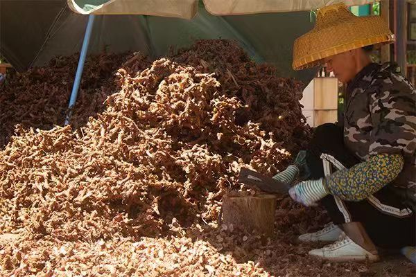 圖2 隊員們收到溫暖后(溫鎮榕攝) 7月13日上午,姜農們展開收尾工作。為更好地保護高良姜中未受雨影響的部分,姜農們細心地檢查高良姜的情況,將未被雨淋過的高良姜堆積在一起,并用刀將這些未淋雨的姜切成塊狀,為下一步的加工工作做足準備。