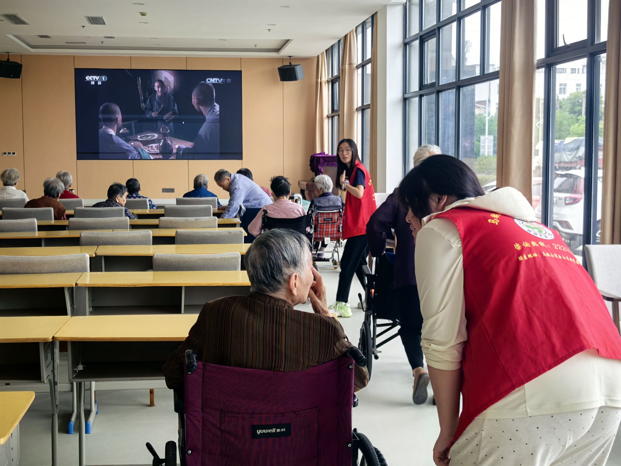 圖為志愿者們協助將老人推送至一樓大廳參與電影觀賞活動 供圖:葉欣雨。