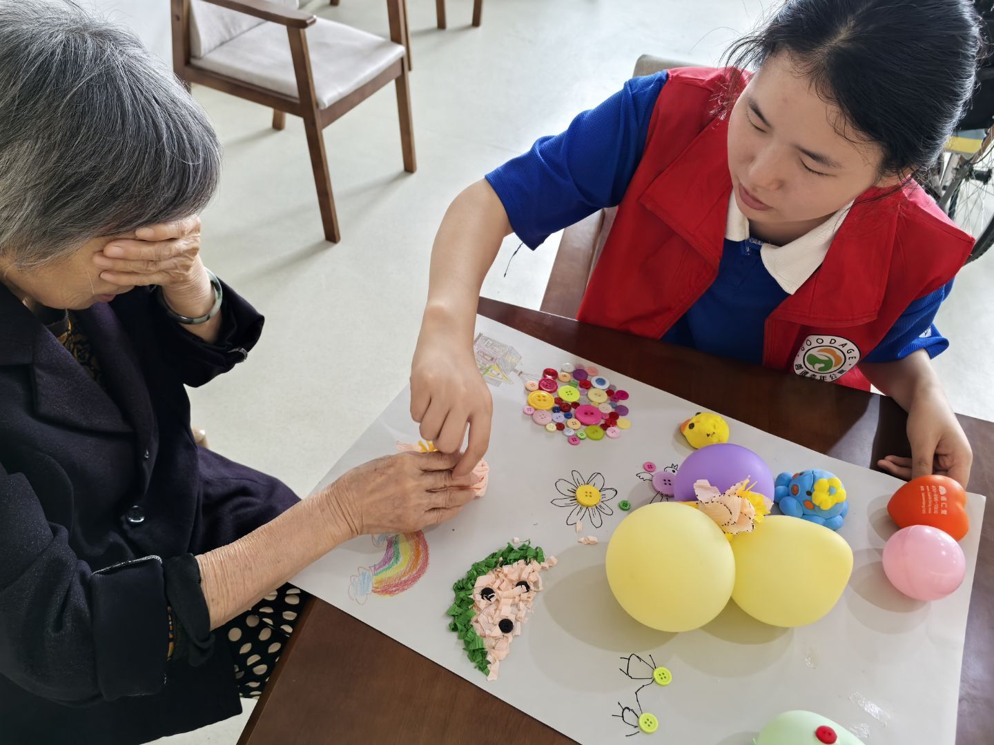 失智專區的志愿者們下午組織開展了手工活動,制作了用于觸感游戲的材料(如不同材質、形狀的物品包),引導老人通過觸摸進行感知訓練。活動期間,志愿者們持續與老人聊天互動,提供陪伴。