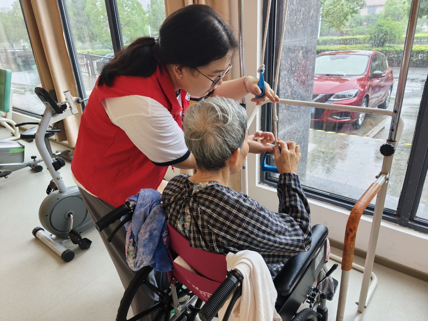 圖為志愿者協助行動不便的老人正確使用康復器材,進行復健訓練。供圖:阿詩怡
