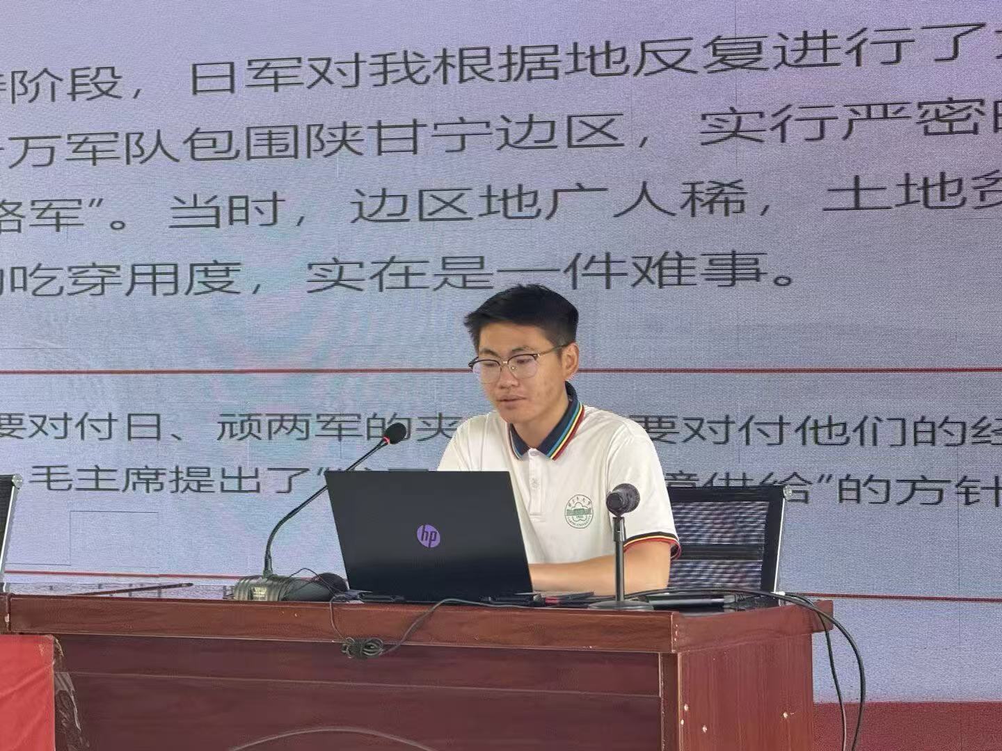 演講中,團(tuán)隊成員從南泥灣大生產(chǎn)運(yùn)動的歷史背景切入,講述1941年三五九旅在生死存亡的封鎖困境中,用镢頭開墾26萬畝荒地、實現(xiàn)“耕一余一”的奇跡。他特別提到毛主席“既要能打仗,又要會生產(chǎn)”的囑托,以及王震將軍與士兵同甘共苦開荒的故事,讓“自力更生、艱苦奮斗”的精神內(nèi)涵變得可感可觸。