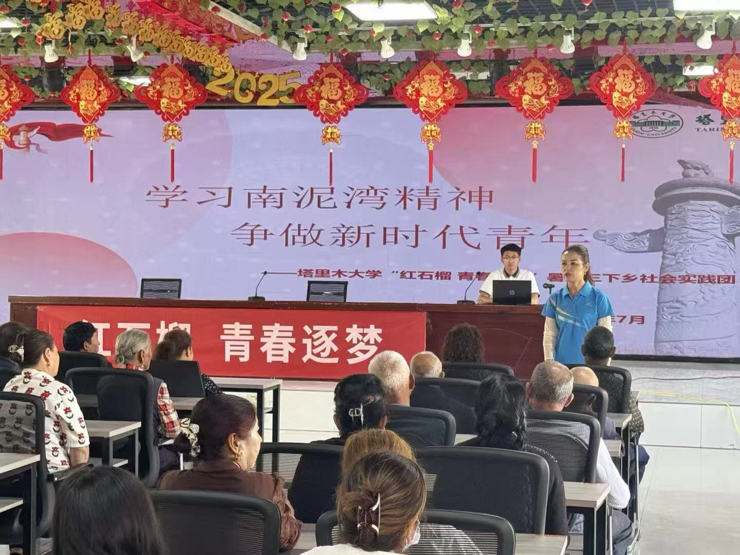 7月7日,塔里木大學(xué)“紅石榴 青春逐夢”暑期三下鄉(xiāng)社會實踐團(tuán)走進(jìn)阿克蘇地區(qū)拜城縣鐵熱克鎮(zhèn)鐵熱克村,宣講人員為當(dāng)?shù)鼐用駧?ldquo;學(xué)習(xí)南泥灣精神,爭做新時代青年”主題演講,用紅色歷史聯(lián)結(jié)邊疆發(fā)展,讓自力更生的精神火種在基層燎原。