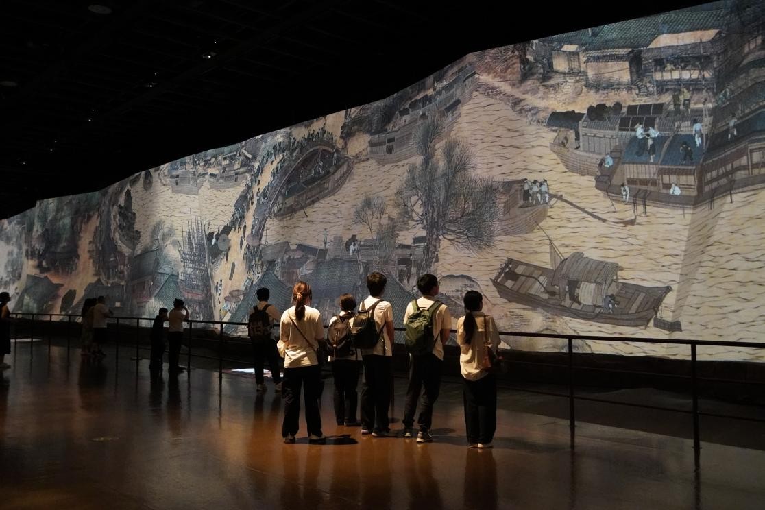 在沉浸式多媒體廳,北宋《清明上河圖》在數(shù)字化演繹的動態(tài)長卷中舟楫往來、市聲如沸,12世紀(jì)汴梁城的木構(gòu)拱橋在數(shù)字技術(shù)中“復(fù)活”,引發(fā)同學(xué)們對古代工程智慧的集體探討。“科技讓文化遺產(chǎn)獲得新生”,實踐團成員表示,“我們未來的設(shè)計,也應(yīng)當(dāng)承載這樣的歷史溫度”。