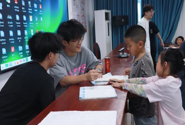 (上圖為“微光致遠(yuǎn)”團(tuán)隊志愿者在輔導(dǎo)教學(xué)小朋友們的作業(yè)。)