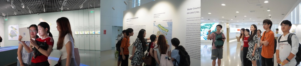 實踐團成員在張宇星同學的帶領下,學習了上海自1931年以來的城市總體規劃歷程。上海這座人民城市的壯麗畫卷,是一代代建設者在黨的領導下,以赤誠初心和精湛技藝共同繪就。墻壁上閃閃發光的“人民城市人民建,人民城市為人民”深刻揭示了城市建設與發展本質,這句箴言在代代建設者手中傳遞,照亮了城市前行的方向。