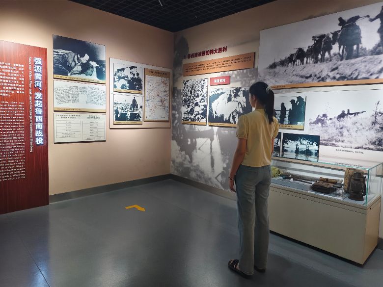 當步入“強渡黃河、發起魯西南戰役”展區,就如同一個時光倒流的機器,將實踐隊員們帶回了那個戰火紛飛的壯烈戰場。戰役地圖上的一道道紅線,珍貴史料中的一段段記載,生動地還原了劉鄧大軍渡河作戰的英勇場景。看著展板上戰士們突破天險的堅毅神情,聽著講解員講述他們在槍林彈雨中穿梭的故事,實踐隊員們的內心被深深觸動。劉鄧大軍為了實現戰略目標,不畏艱險,強渡黃河,與敵人展開了激烈的戰斗。他們的熱血與信仰,在這片土地上交織共鳴,鑄就了偉大的勝利。