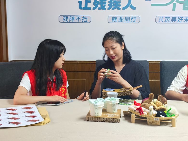 二、市場賦能:善達未來的破冰探索 “殘疾人之家是第一道港灣,真正走向社會還需專業力量。”善達未來助殘服務中心正搭建就業轉化橋梁。面對肢體障礙、聽障、心智障礙等多元群體,善達未來摸索出適配路徑:為聽障設計師組建專屬項目組,由“橋梁”主管協調溝通;為外向心智障礙者開拓市集崗位,采用“聽障+心智障礙”融合搭檔模式。其開發的“聊贈一杯春”文創茶品,包裝附二維碼展示殘障伙伴工作場景,環保小包裝設計在市集廣受歡迎,讓殘障伙伴的努力被社會看見。負責人陳咪老師直言: