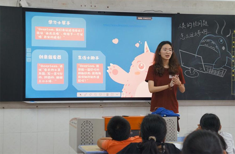 第二節課,團隊首先以“身邊的AI”為主題,向孩子們介紹了日常生活中常見的人工智能工具,如語音助手、人臉識別等,并重點展示了DeepSeek這一先進的AI對話模型。孩子們踴躍提問:“AI會取代人類嗎?”“它怎么知道這么多答案?”老師們借此引導大家思考AI時代的機遇與挑戰,強調了保護隱私、辨別信息真偽的重要性,鼓勵孩子們在擁抱科技的同時保持批判性思維。