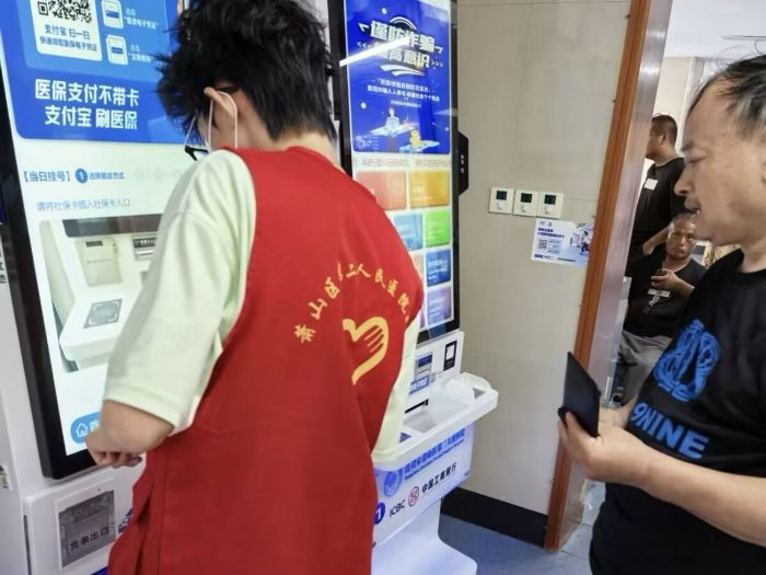 圖為實踐團于浙江省杭州市蕭山區第二人民醫院幫助老人使用自動掛號機 施佑霖攝