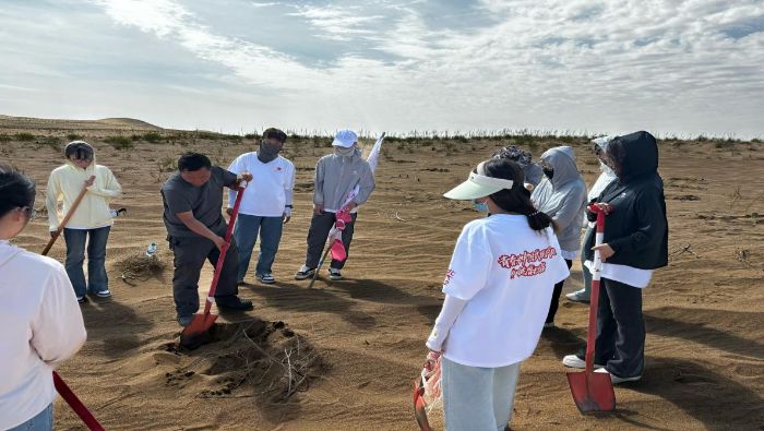 仲麟生態公益林基地作為黨和國家生態保護戰略引領下、凝聚社會各界尤其是各族群眾合力建設的重點生態工程示范點,始終踐行“國家主導、科技支撐、全民參與”的治理模式。實踐團成員抵達基地后,在工作人員的帶領下深入梭梭種植區開展灌溉與填土工作。在親手挖出沙坑和拉著水管澆灌梭梭的過程中,成員們深刻體會到,在沙漠中讓一株幼苗扎根絕非易事,每一株梭梭的存活,都是各族治沙人在黨的領導下,以“守護家鄉”的信念數十年接力堅守的成果。