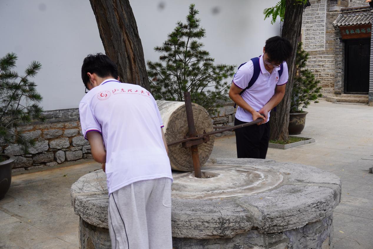 抵達(dá)焦裕祿故居后,實(shí)踐團(tuán)成員首先來到焦家油坊門前,對(duì)石磨盤進(jìn)行了體驗(yàn)。在講解員的指導(dǎo)下,同學(xué)們親手轉(zhuǎn)動(dòng)石磨盤,感受著其中蘊(yùn)含的勞動(dòng)艱辛與生活智慧。