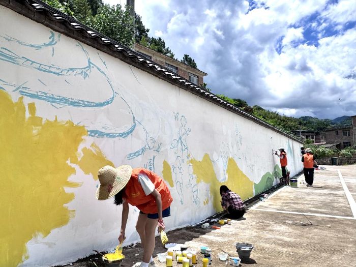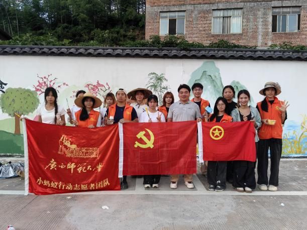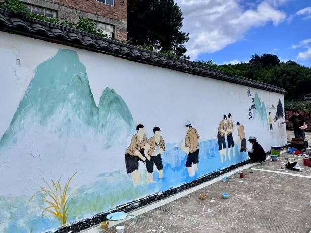 完成深度調研后,團隊聚焦鄉(xiāng)村環(huán)境美化,在梅溪鎮(zhèn)正式啟動墻繪創(chuàng)作。 隊員們精心提煉調研中發(fā)現(xiàn)的油菜花、稻田、梅花等標志性本土元素,精選村內墻面、公共活動場所以及游客必經路段作為畫布,將梅溪鎮(zhèn)的自然風光、特色作物與傳統(tǒng)民俗巧妙融入一幅幅墻繪之中。 13名隊員腳踏斑駁的顏料鞋,身著醒目的橙色馬甲,穿梭于鄉(xiāng)間地頭。 在一張團隊合影里,青年們高舉“廣西師范大學志愿者團隊”旗幟,身后連綿的青山與躍然墻上的藝術圖景,共同定格了藝術與鄉(xiāng)土的深度交融。