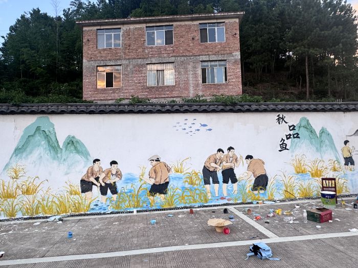 隨后團隊抵達梅溪鎮,團隊成員迅速與當地干部群眾對接,了解當地歷史文化、民俗風情和鄉村特色。因梅溪鎮自然景觀豐富、人文底蘊深厚,為墻繪創作提供了素材,成員們實地考察待繪墻面,結合當地特色構思墻繪主題與內容。創作中,成員分工明確、配合默契,發揮專業優勢,用嫻熟技巧將對鄉村的熱愛與愿景融入畫作。從構圖到繪制,每個環節都傾注心血。最終以“春看花、夏食李、秋品魚、冬賞梅”為主題,展現梅溪鎮四季特色景致與人文活動,讓單調墻面煥發生機。