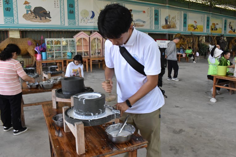 米漿在蒸布上慢慢鼓起,變成半透明的薄衣,像被陽光吻過的云朵。實踐團成員手忙腳亂地卷著小卷粉,蘿卜絲從邊緣漏出來,引來一陣輕笑;有人專注地盯著石磨,看著米漿順著磨盤緩緩流淌,仿佛在醞釀一汪月光。