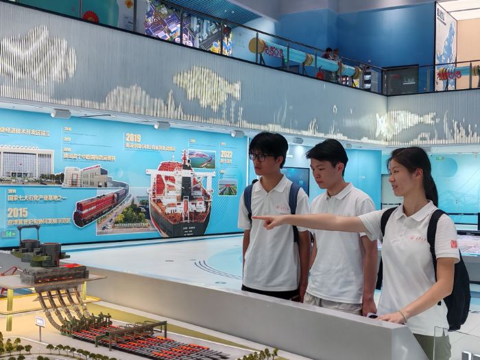 實踐的第二站來到了曹妃甸城市館。在這里,隊員們通過詳實的圖文資料、精致的沙盤模型以及現代化的多媒體展示,系統了解了曹妃甸從一片鹽堿灘涂崛起為現代化工業新城的輝煌歷程。他們重點學習了曹妃甸科學前瞻的城市總體規劃布局、產業轉型升級的戰略路徑以及面向未來的宏偉發展愿景。參觀使隊員們對這座“因港而興”的城市發展脈絡、空間結構及綠色低碳轉型方向有了更為清晰和立體的認知。