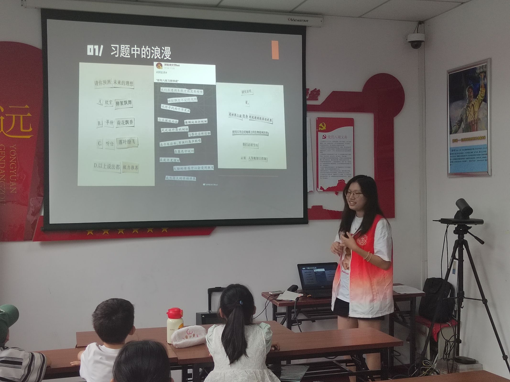 2025 年 7 月 24 日,山東大學(xué)護(hù)理與康復(fù)學(xué)院南丁格爾志愿服務(wù)隊的紀(jì)丹陽老師,為小朋友們帶來了一堂充滿創(chuàng)意的 “拼貼詩奇妙創(chuàng)作課”。這堂課旨在讓孩子們領(lǐng)略文字重組的獨特魅力,感受詩歌創(chuàng)作的多元可能,激發(fā)他們對語言表達(dá)的興趣與創(chuàng)造力。
