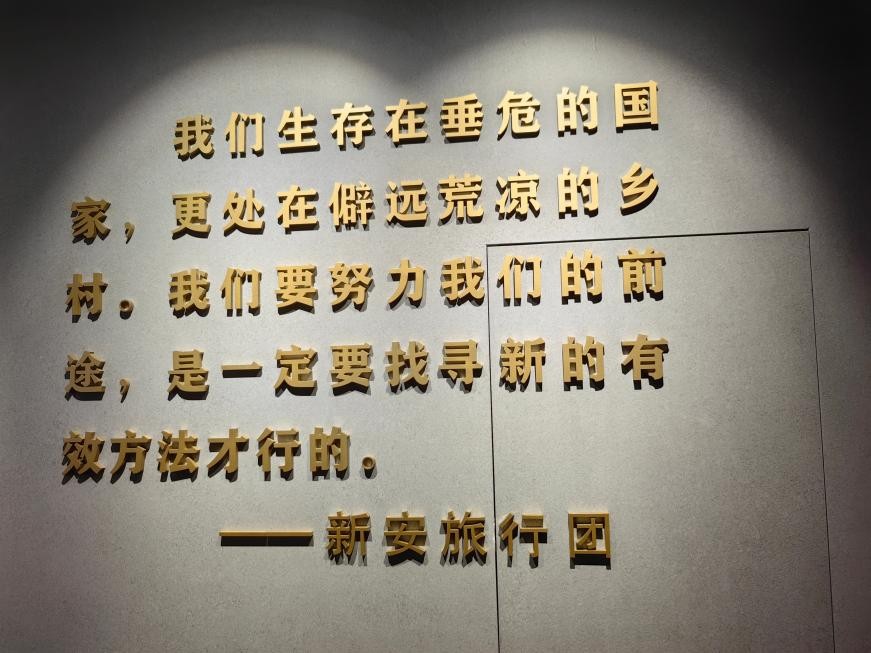 晨光熹微,實(shí)踐組員踏入新安旅行團(tuán)歷史紀(jì)念館。展館入口處“一群小好漢,救國走天下”的浮雕赫然入目。1935年,14名淮安少年以新安小學(xué)為起點(diǎn),攜電影機(jī)、報(bào)刊行程5萬余里,足跡遍及全國22省。在“背著電影機(jī)抗日”復(fù)原場景中,泛黃的《抗日畫報(bào)》手稿與銹跡斑斑的膠片箱見證崢嶸歲月。