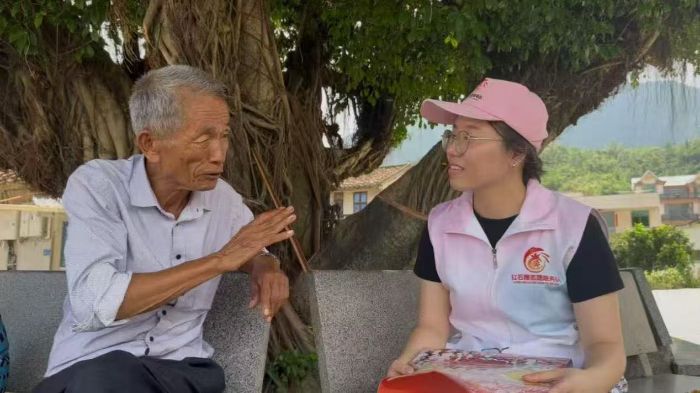 8月7日清晨,成員在八井村歷史最久的榕樹下,采訪了畬族老人,圍繞畬族文化傳承現狀提出問題,同時開展民族文化宣講,并采用漢語結合畬語基礎內容的雙語方式互動,拉近了與老人的距離,激發了文化交流熱情。上午,成員走訪八井村村民家中,進行了問卷調查,了解了畬族文化傳承認知與實際困難。