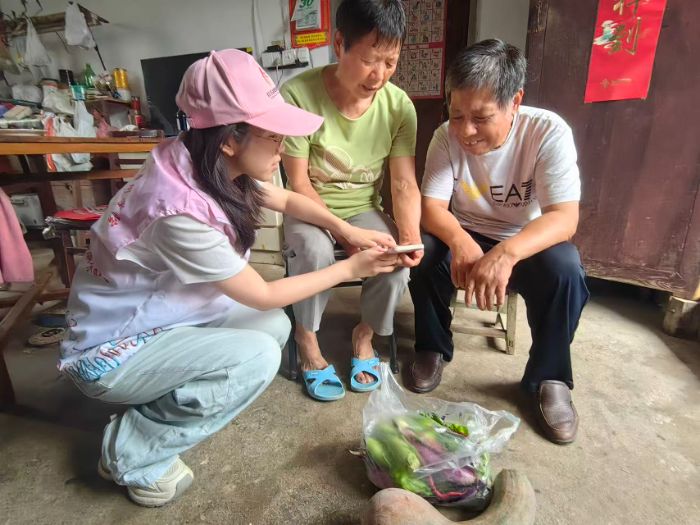 7月31日上午,團隊成員走進天馬鎮街巷,與售賣蔬菜的農戶、制作豆腐的阿婆交流,用手機記錄當地方言與民風。隨后跟隨農民深入田間,了解玉米、茄子、絲瓜等農作物的種植流程。一位農民介紹了應對暴雨和病蟲害的傳統方法,如用辣椒水驅蟲、加固支架防倒伏等,體現了傳統農耕智慧與現代經驗的結合。團隊成員參與農產品裝袋,體驗勞作與收獲過程。期間,志愿隊同步開展民族文化宣傳,向農戶發放民族知識手冊,介紹各民族傳統節日、飲食文化等內容,講解民族團結相關政策,增進農民對多民族文化的認知。