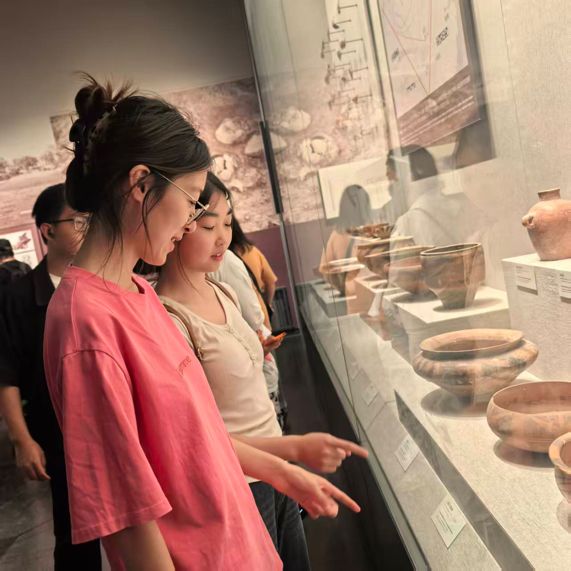圖為參觀河南博物院史前陶器展品 李雪瑩攝
