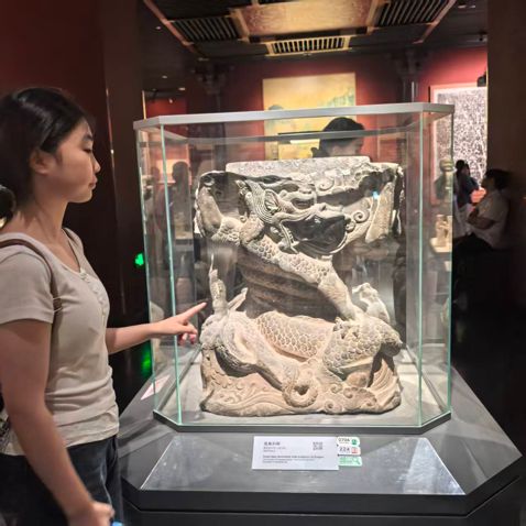“這是唐代建筑柱礎(chǔ),用于支撐立柱,龍紋彰顯建筑等級(jí)。” 隨行講解員話(huà)音落下,隊(duì)員們轉(zhuǎn)而留意石座底部的磨損痕跡——凹陷處與邊緣的光滑度,暗示它曾承載的重量與歲月中的使用頻率。有隊(duì)員發(fā)現(xiàn),石座龍紋與唐代壁畫(huà)中的龍?jiān)煨透叨认嗨疲航詮?qiáng)調(diào)肌肉線條的力量感與神態(tài)的威嚴(yán)感,呼應(yīng)唐代“以壯為美”的審美取向。展廳暖黃色燈光灑在石面上,龍首瞳孔處的深淺雕刻在光影中更顯神韻,隊(duì)員們調(diào)整角度,試圖捕捉工匠藏在細(xì)節(jié)里的巧思。