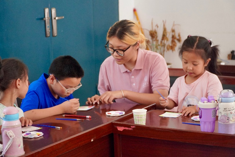 繪畫,被實踐隊員們視為一把鑰匙——它能開啟孩子們心中那片用言語難以描繪的奇妙天地,也悄然承載著一方水土的文化印記。隊員們鼓勵孩子們拿起畫筆自由揮灑,描繪心中所思所想。實踐隊員與孩子們并肩俯身于畫紙兩側,相同的專注神情在筆尖流轉間凝結成深厚情誼——藝術在此刻成為跨越年齡、連接心靈的無聲紐帶。