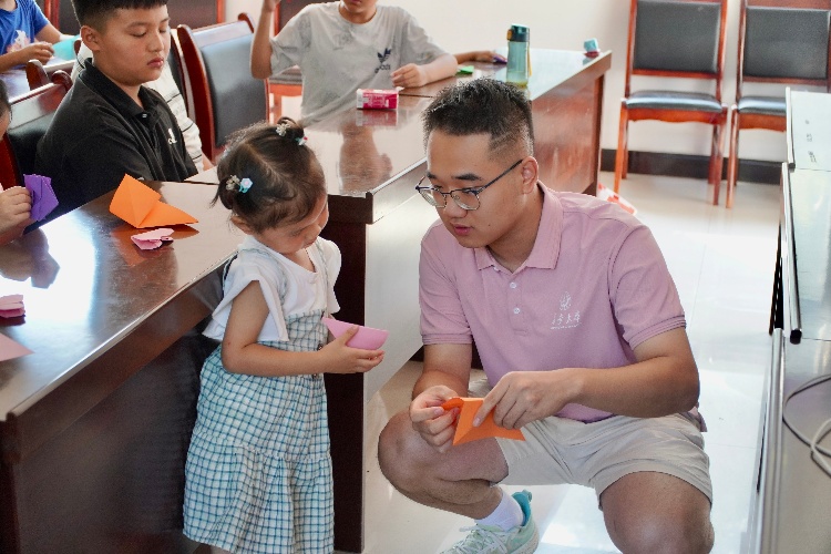 牽動心靈的不止一幅美麗的畫卷,當一張張平凡的彩紙發到孩子們手中,創造力的魔法瞬間被激活。實踐隊成員王一博、張玄溦、薛志鵬、黃喆愷為孩子們演示了對折技巧、邊緣處理等基本功后,小小的空間里立刻充滿了無限可能。活動的高潮是一場充滿儀式感的“折紙奇遇分享會”,孩子們爭先恐后上臺,手捧作品,或是千紙鶴的精巧、烏篷船的質樸,又或是玫瑰花的爛漫,“東南西北”的趣味變幻。