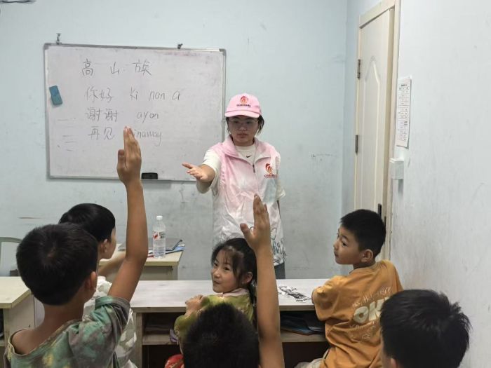 在民族語言教學環節,選取“你好(ki non a)”“謝謝(ayon)”“再見(mianway)”等簡單實用的高山族日常用語,通過拼音標注、發音示范和逐字領讀等方式,讓孩子們學習發音與含義。期間,穿插“你說我猜”“快速搶答”等語言小游戲,志愿團隊成員用高山族語說詞語,孩子們搶答漢語意思,極大活躍課堂氛圍,加深孩子們對高山族語言的記憶理解,讓原本陌生的民族語言變得鮮活有趣 。