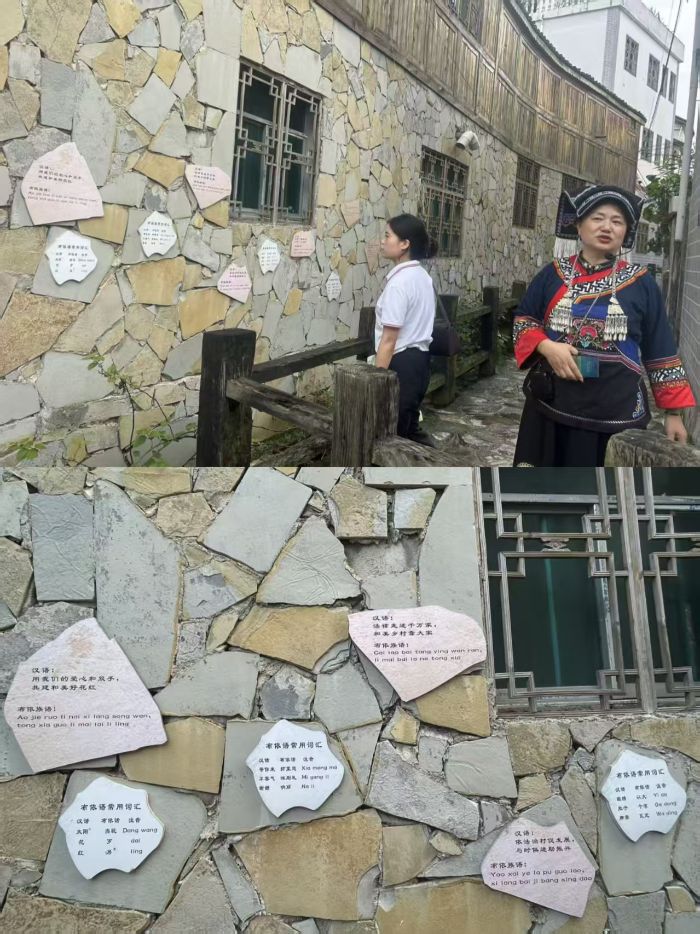 下午的實(shí)踐行程從“布依語(yǔ)言文明墻”研學(xué)開啟。在旅游使館解說(shuō)員的帶領(lǐng)下,學(xué)子們逐一觀察墻面鑲嵌的20余塊刻字碎石,上面用“漢布依對(duì)照”方式標(biāo)注了“家人”“學(xué)校”“感謝”等日常用語(yǔ),如“老師”對(duì)應(yīng)布依語(yǔ)“sangs”、“朋友”對(duì)應(yīng)“biangx youq”。解說(shuō)員結(jié)合發(fā)音口型演示布依語(yǔ)聲調(diào)規(guī)律,以布依族經(jīng)典民歌《好花紅》的“五句式”韻律為案例,對(duì)比分析其與漢語(yǔ)詩(shī)歌的節(jié)奏差異,闡釋“借歌傳情、以語(yǔ)達(dá)意”的布依文化表達(dá)特色。將語(yǔ)言學(xué)習(xí)與民族傳承歌曲相結(jié)合,增強(qiáng)學(xué)子的語(yǔ)言文化認(rèn)同感。