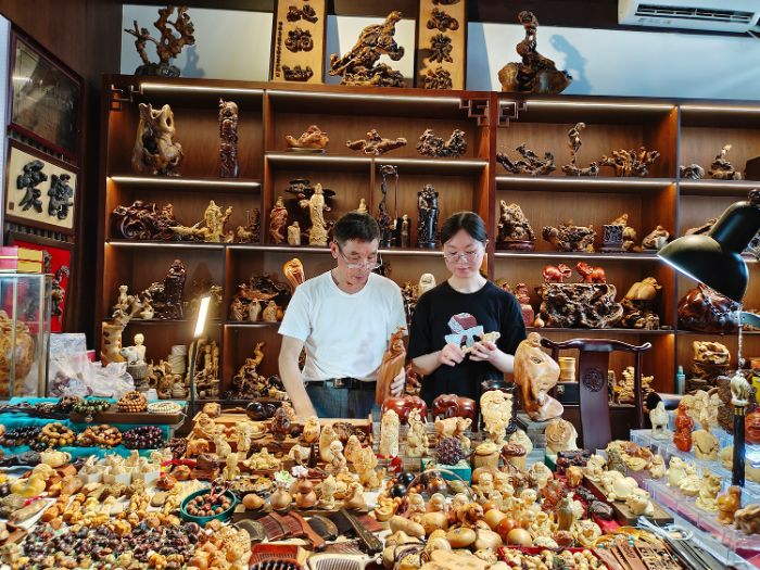 訪談互動中,萬老師分享的根雕家族傳承故事,引發志愿隊成員對少數民族技藝傳承模式的探討。隊員們現場講述了侗族大歌“口傳心授”、維吾爾族木卡姆家族傳承等案例,與根雕傳承理念形成對照交流。針對根雕與現代文化融合的實踐,志愿隊提出可借鑒少數民族文化創新經驗,如將傣族孔雀元素、壯族銅鼓紋樣融入根雕創作,進一步豐富作品的民族文化內涵。