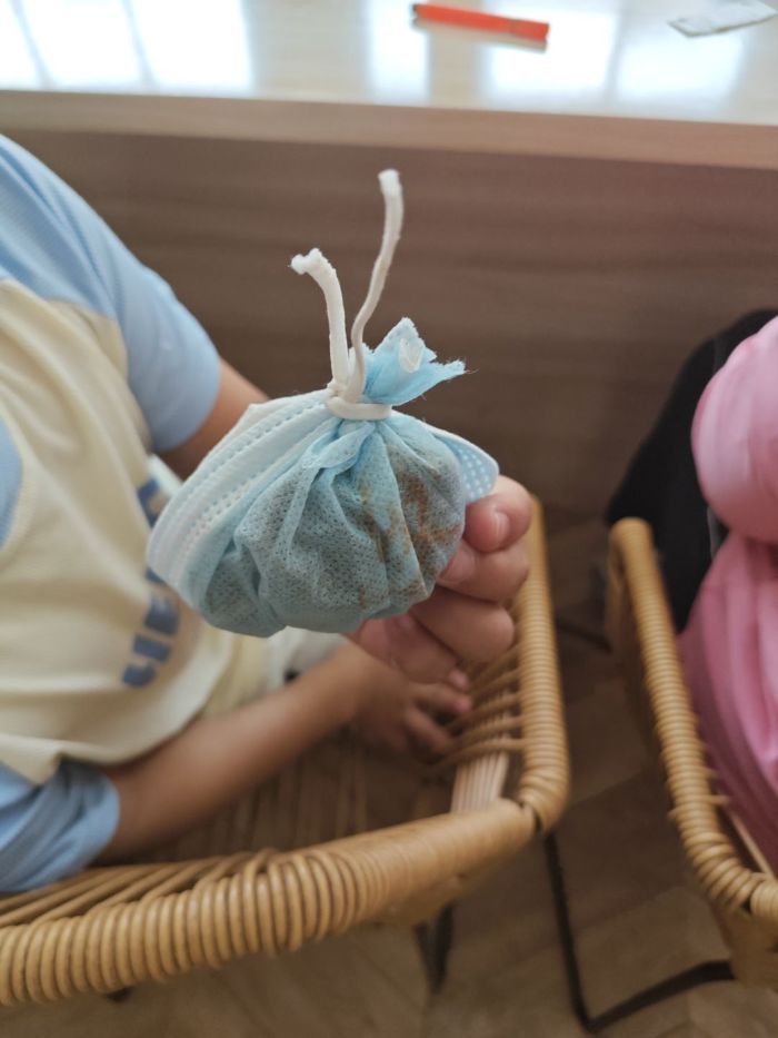 隨后進入本次活動的高潮——手工制作艾草香囊環節。在志愿者耐心細致的“手把手”指導下,青年們興致勃勃地動手操作起來:先將口罩兩側的耳繩小心剪下備用,再將展開的口罩主體作為天然的香囊袋,裝入志愿者們提前準備好的、散發著獨特清香的干艾草葉,最后巧妙地利用剪下的口罩繩將袋口系成一個個漂亮的蝴蝶結。整個過程中,志愿者們始終在一旁耐心協助,鼓勵大家發揮藝術創意,用五顏六色的彩筆在香囊上繪制自己喜歡的圖案,創作出獨一無二、專屬自己的艾草香囊。