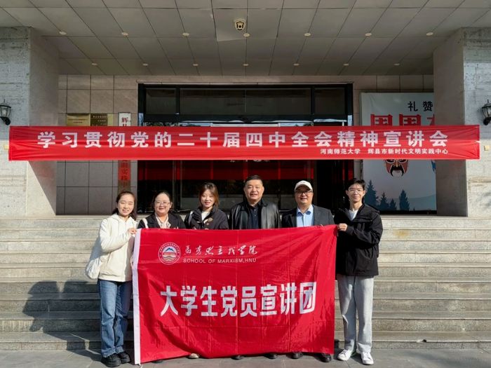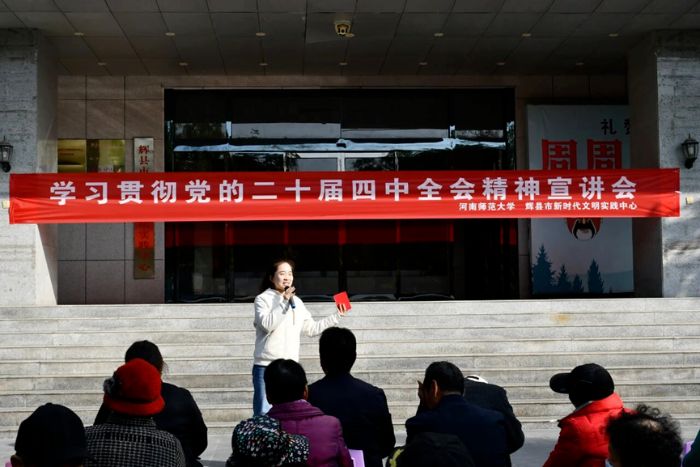 “咱鄉親們今天在這兒美妙的歌聲就是我們文化強國建設在基層的具象化”。11月13日,河南師范大學馬克思主義學院黨員宣講團走進新鄉輝縣市,在輝縣市新時代文明實踐中心開展黨的二十屆四中全會精神專題宣講活動,學院張鋒老師、博士研究生王青鶴及碩士研究生劉鑫雨分別登臺宣講,近兩百名干部群眾現場聆聽。此次宣講依托校地文明實踐共建平臺,將全會精神與百姓生活實際緊密結合,讓黨的創新理論在基層落地生根。