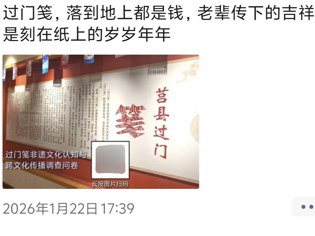 2026年1月15日,曲阜師范大學翻譯學院“河潤千年,箋承一脈”實踐隊,圍繞過門箋相關內容發布了調查問卷。問卷旨在了解大眾對過門箋及黃河流域非遺文化傳播的認知與看法,及其在跨文化翻譯與傳播中的看法。