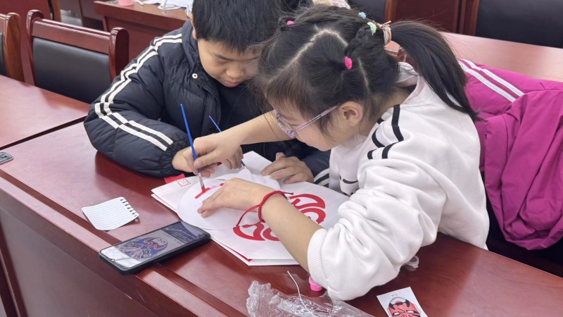 進入臉譜繪畫環節,祝小傲為孩子們分發了空白面具、各色顏料與畫筆,讓大家以課件中的臉譜示例為參考,自由發揮想象,在面具上創作專屬的京劇臉譜。他先現場演示了臉譜輪廓勾勒、色彩填充的基本方法,叮囑孩子們注意線條的規整與色彩的搭配,對低年級孩子引導其模仿經典臉譜的配色與造型,對高年級孩子則鼓勵其大膽創新,為臉譜融入自己的想法與設計。