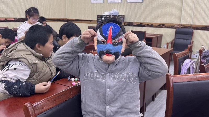 祝小傲穿梭在孩子們之間,隨時為遇到難題的孩子答疑解惑、提供指導,手把手教孩子們調試顏料、勾勒流暢線條。看著孩子們從最初的手足無措,到慢慢摸索出技巧,一點點為空白面具賦予鮮活的色彩與獨特的靈魂,臉上漾起滿滿的成就感,祝小傲的心中也滿是暖意。創作過程中,孩子們還會主動交流想法,分享繪畫的小技巧,彼此啟發、互相學習,小小的教室中,既有著創作的專注,更有著同伴間的美好互動。祝小傲也在這個過程中深深體會到教學相長的真諦,孩子們的奇思妙想,也讓他對京劇臉譜的多元表達有了新的思考與感悟。