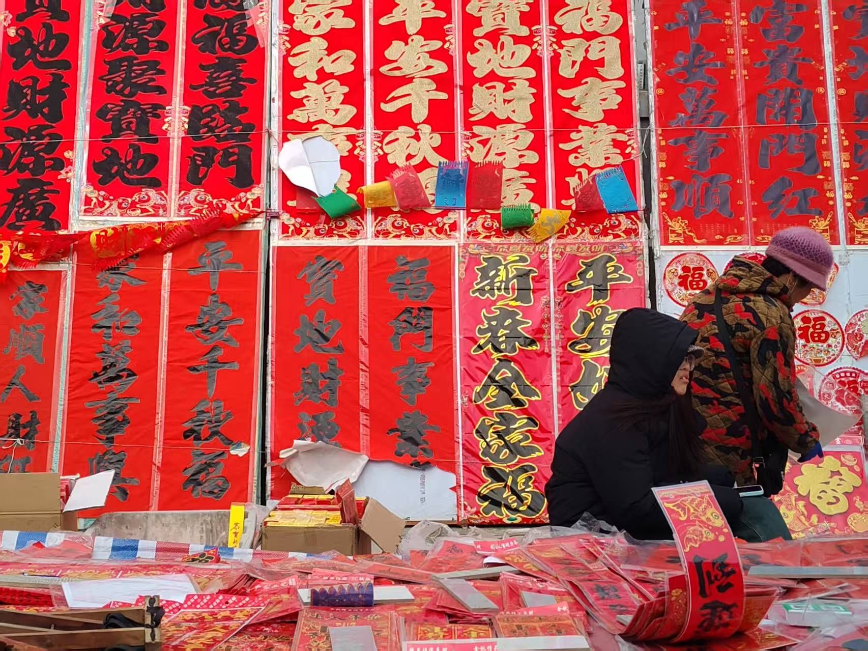 在大集南段的春聯攤位前,攤主李師傅正整理著貨物。案臺上,大紅過門箋碼得整整齊齊,金色“福”字飽滿圓潤,牡丹、石榴紋樣栩栩如生,流蘇輕晃,透著說不盡的喜慶。