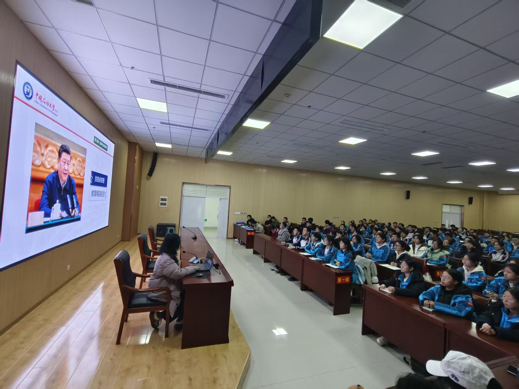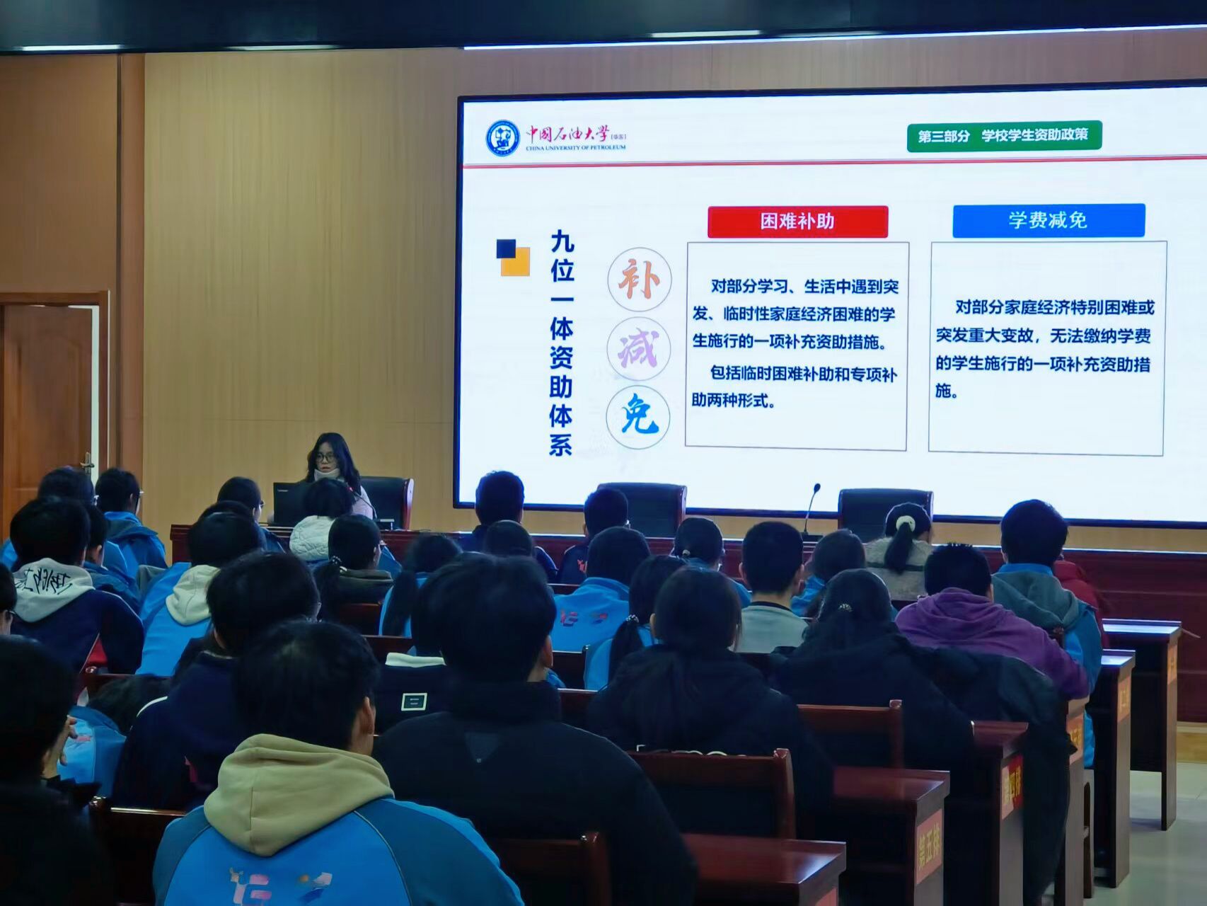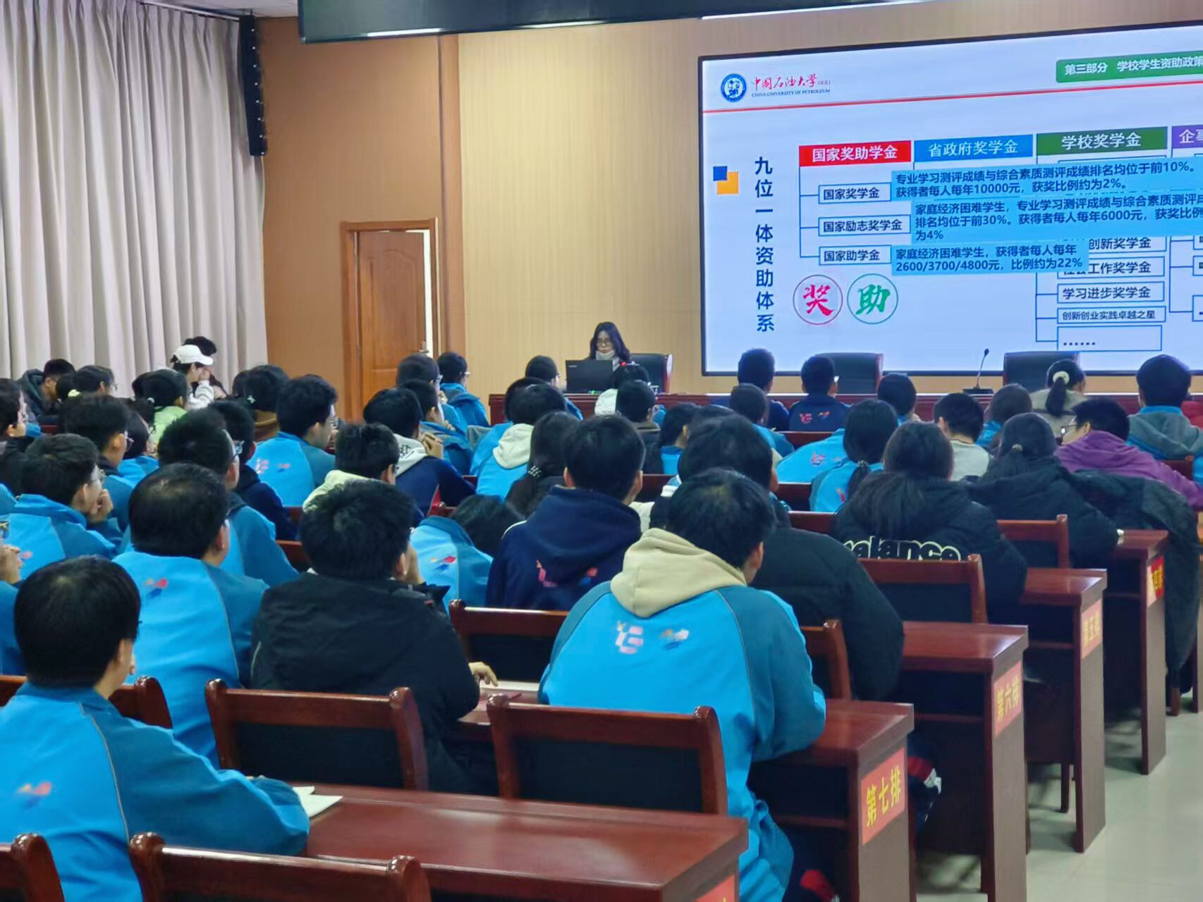 宣講活動在學校的多媒體教室舉行,現場座無虛席。李洪音圍繞精心準備的四大板塊——學校畢業生就業情況、國家學生資助政策、學校特色資助體系及學校整體簡介,展開了深入細致的講解。她通過詳實的數據圖表,生動展示了學校近年來畢業生高就業率、高質量就業以及高升學比例的育人成果,讓在場學子對未來的大學生活充滿憧憬。在解讀資助政策時,她不僅全面梳理了從基礎教育到研究生教育的全學段國家資助體系,還重點介紹了中國石油大學(華東)獨具特色的“九位一體”資助體系,包括綠色通道、勤工助學崗位、困難補助、學費減免等具體措施,確保每一位學生都不會因家庭經濟困難而失學。此外,李洪音還結合自身經歷,分享了高三備考時的奮斗故事和學習方法,鼓勵學弟學妹們珍惜當下,奮勇拼搏,用汗水澆灌夢想。