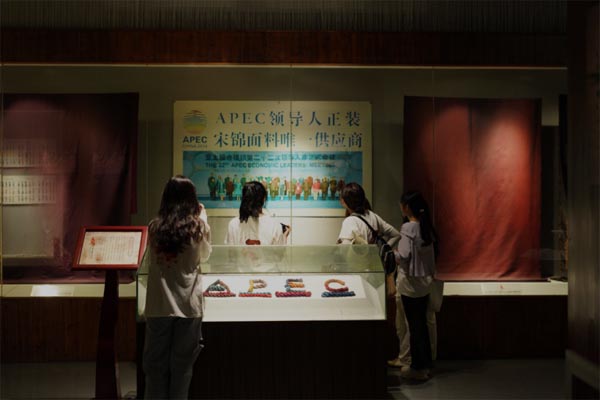 實地調研過程中,實踐團參觀了上久楷面料館、宋錦精品展示區等場所。實踐團成員詳細詢問了宋錦非遺文化的傳承和創新。企業工作人員為實踐團成員介紹“上久楷”企業研制了出世界上第一臺符合傳統宋錦織造工藝和各項技術參數的電子提花機,實現了宋錦絲綢的產業化發展,并在2014年北京APEC會議,承接了APEC“新中裝”面料的生產任務,成功把宋錦絲綢推向了新的高度,吸引了世界的目光。“上久楷”宋錦還相繼在第四屆國際資本峰會展覽、“絲綢之路”國際大會中國絲綢展、米蘭時裝周、米蘭世博會等國際舞臺上嶄露頭角,展現中國非物質文化遺產的魅力,成為連接世界各國友誼的一條美麗紐帶,作為展示中國優秀傳統文化的一張亮麗名片。“上久楷”企業為傳統民族服飾及傳統紡染織繡技藝類國家級非遺代表性項目搭建了展示、交流、弘揚的平臺,在傳統工藝振興、精準文化扶貧工作方面發揮了重要作用。
