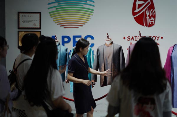 圖為“上久楷”企業工作人員為實踐團成員講解APEC“新中裝”
