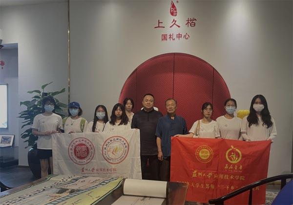 為貫徹落實習近平新時代中國特色社會主義思想,喜迎二十大,奮進新征程,永遠跟黨走,引導大學生在實踐活動中受教育,長才干,作貢獻。2022年8月10日,蘇州大學應用技術學院商學院“薪火相傳”暑期社會實踐團奔赴蘇州上久楷絲綢文化公司開展調研活動。實踐團探索蘇州“上久楷”企業共建共享機制,結合地方資源稟賦和特色,擦亮紅色文化“金字招牌”,推動宋錦非遺文化進課程、進線路,助力學生德智體美勞全面發展。