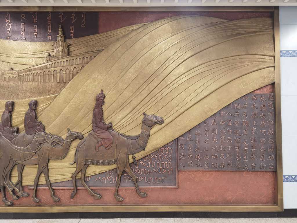 接著,實踐團來到開遠門站,此站得名于唐長安城開遠門遺址,以唐開遠門復原圖為標識。文化墻以《絲路風情》為題,采用現代雕刻工藝,18類不同工種,23種不同石材,為中國國內首創。另有以西域文化“東浙”為題材的壁畫《佳種絲路來》。該站周邊另有絲綢之路的起點——絲路群雕,是為了紀念絲綢之路2100周年而建立的,整座雕塑宏偉壯觀,生動地再現了絲綢之路上的浩大場景。