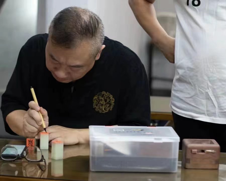 丁明——汕頭市金平區(qū)政協(xié)常委、廣東省印章行業(yè)協(xié)會副會長、廣東省印章技術(shù)培訓(xùn)中心主任教研組組長、汕頭市刻印廠廠長、潮人書畫院副院長、廣東游刃齋藝術(shù)總監(jiān)、東興印章技術(shù)總監(jiān)。首先,丁明先生介紹,印章是中華傳統(tǒng)文化中一朵藝術(shù)奇葩,與書法、國畫、詩歌并稱中國四大藝術(shù),其由手工鐫刻的印章,是漢字藝術(shù)的一種表現(xiàn)形式。隨后,隊(duì)員們通過丁明先生現(xiàn)場講解以及觀看視頻了解到特制印尼的制作方法和歷程,印章鐫刻技術(shù)傳承了古老的工藝。在丁明先生的講解和展示下,隊(duì)員零距離感受到印章鐫刻的獨(dú)特魅力。