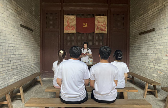 圖為實踐隊隊員在毛澤東舊居學思踐悟黨的二十大精神和習近平總書記視察于都重要講話精神。