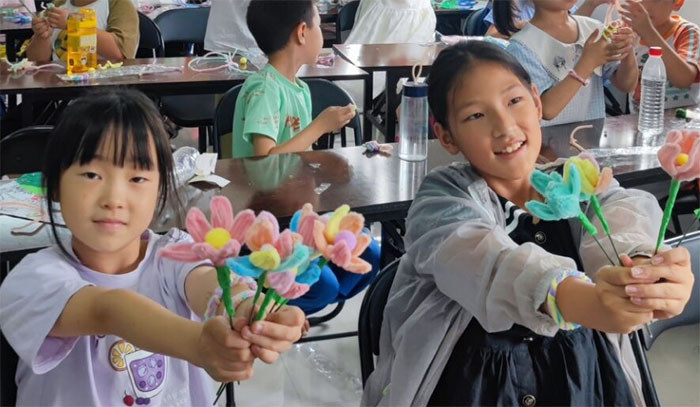 書(shū)法課堂上,志愿者向小朋友們介紹了書(shū)法、漆藝、京劇臉譜等中國(guó)傳統(tǒng)非物質(zhì)文化遺產(chǎn),讓小朋友們了解中華民族的歷史和文化傳統(tǒng),培養(yǎng)文化自信。“左手按紙,右手懸臂執(zhí)筆,注意拇指壓,食指夾,中指勾過(guò)來(lái)”。志愿者們認(rèn)真講解基本的書(shū)寫(xiě)姿勢(shì)、握筆控筆方法。志愿者們通過(guò)游戲互動(dòng)、搶答、討論環(huán)節(jié),引導(dǎo)孩子們?nèi)硇耐度胝n堂,教室里的氣氛輕松活躍。在志愿者的指導(dǎo)下,孩子們紛紛完成屬于自己的美術(shù)作品。“快來(lái)看看我做的藝術(shù)品”。在作品展示環(huán)節(jié),小朋友們紛紛驕傲地把自己的作品展現(xiàn)在鏡頭之下。一幅幅生動(dòng)形象的作品凝結(jié)著孩子們豐富的想象力和創(chuàng)造力,也凝結(jié)著志愿者們辛勤的智慧和汗水。小朋友們對(duì)志愿者說(shuō):“這些課程太酷啦,哥哥、姐姐你們明年還能再來(lái)給我們上課嗎?”