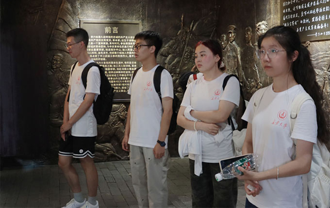 圖為實踐隊員仔細閱覽李六如生平事跡資料展示墻