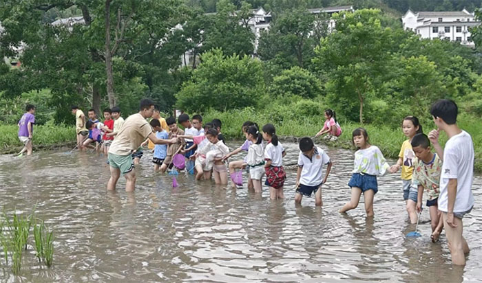 志愿者老師向孩子簡(jiǎn)單講解“蝦稻共作共生”原理,之后帶領(lǐng)孩子下田捕魚,孩子們沉醉在寓教于樂的游戲中,老師們大手牽小手拉近彼此,讓孩子們體驗(yàn)團(tuán)隊(duì)協(xié)作帶來的快樂。