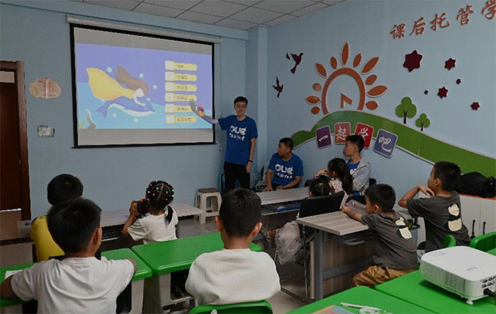 圖為志愿者為小朋友輔導(dǎo)作業(yè)。