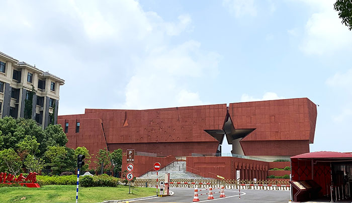 上午十一點,我們來到了南京市渡江戰役勝利紀念館,放眼望去分為兩個館區,一個渡江戰役館,一個百年黨史館。場館入口做成了五角星,周圍墻面也有紅星相伴。我們首先進入了這渡江戰役的星星之館,仔細閱讀一樓的戰爭歷史記載,觀看在負一樓的戰場全息投影。